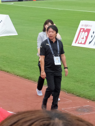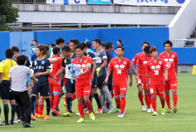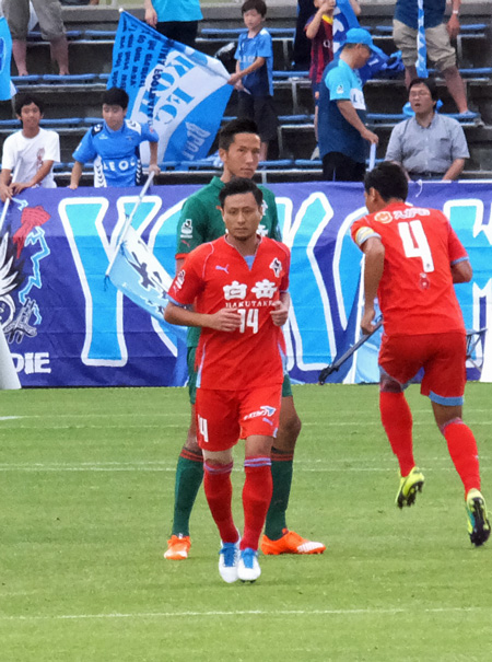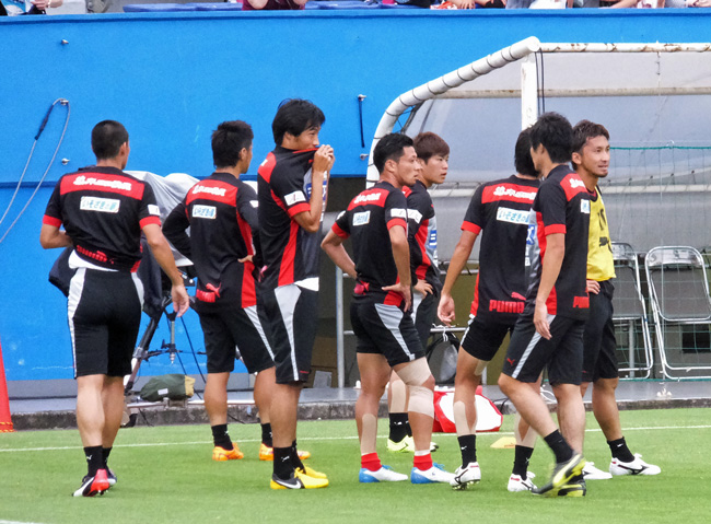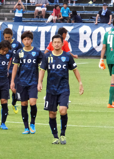コイントスで陣地交代を選んだ横浜FC。こっちに向かって歩いてくるキングカズの堂々たるお姿。