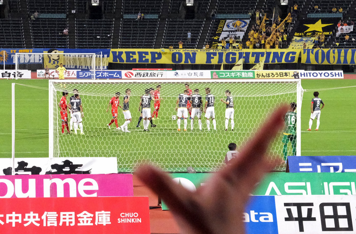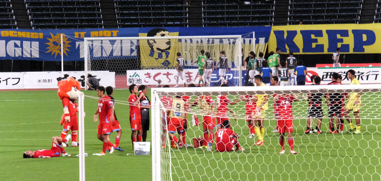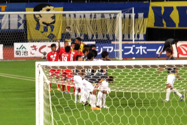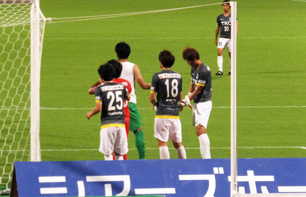 FK直前ゴール裏から見るとこの陣形。明らかにGKがちっちゃくなった。ボールの前には蹴る気満々の二人。オレが蹴るぞオーラがボウボウしてたのはもちろんシンタロくん。