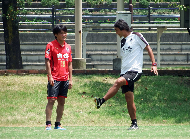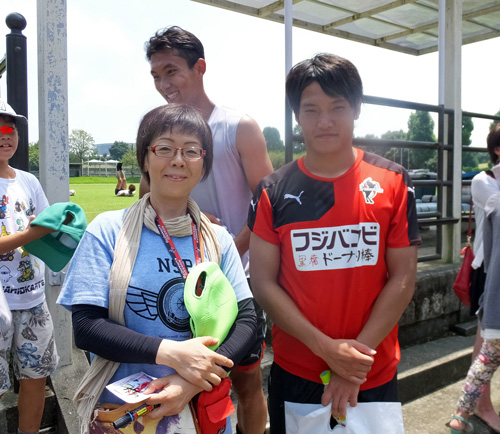 後で気づいた次第ながら、実は2年前の東日本大震災チャリティマッチで出会ってた静岡のキタジサポさん(可愛いお嬢さん♪)が来熊されていて、練習後にクラブハウスに帰ってくるキタジコーチをずーっと待っていらっしゃったんだけど。