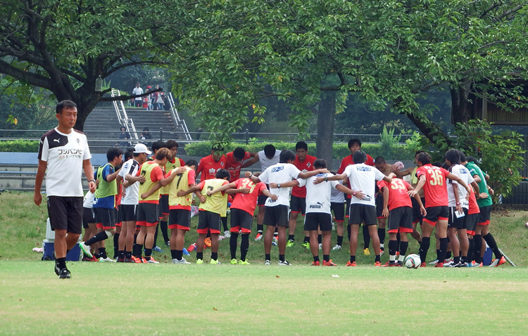 みんなが輪になるのはロアッソの基本。個人的に「知恵の輪」と呼んでるんです。監督は「知恵の泉」語感が古いけどまあいいよ(-_-)