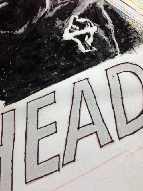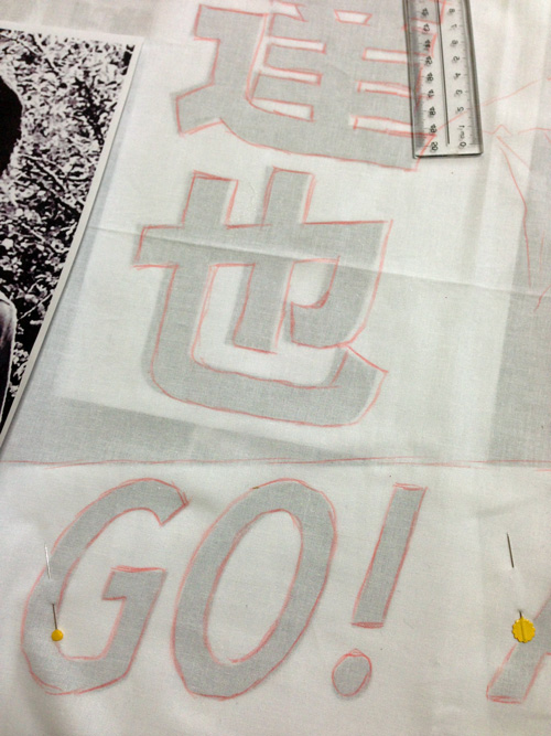 文字と写真を決めて出力したら大きさと配置を見ながらサイズを調整して決定稿を出力して生地に転写。当然ながら画像はTM見学で撮ったもの。
