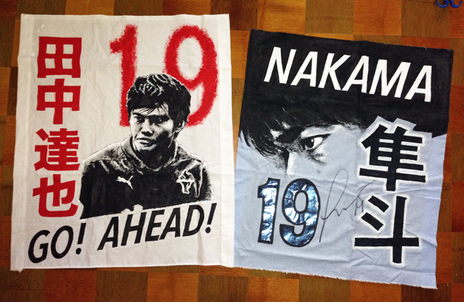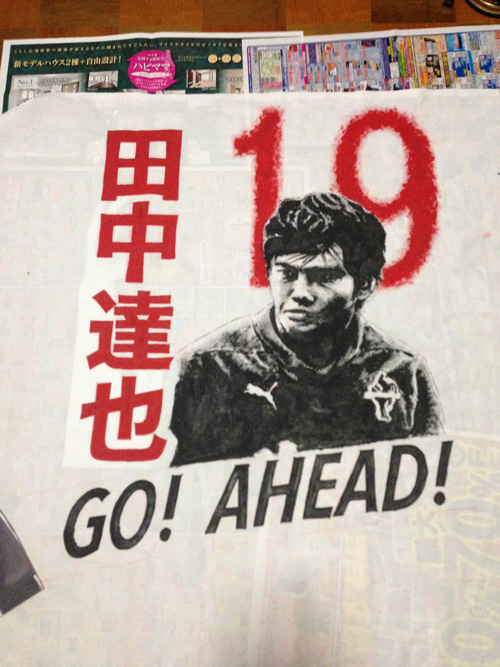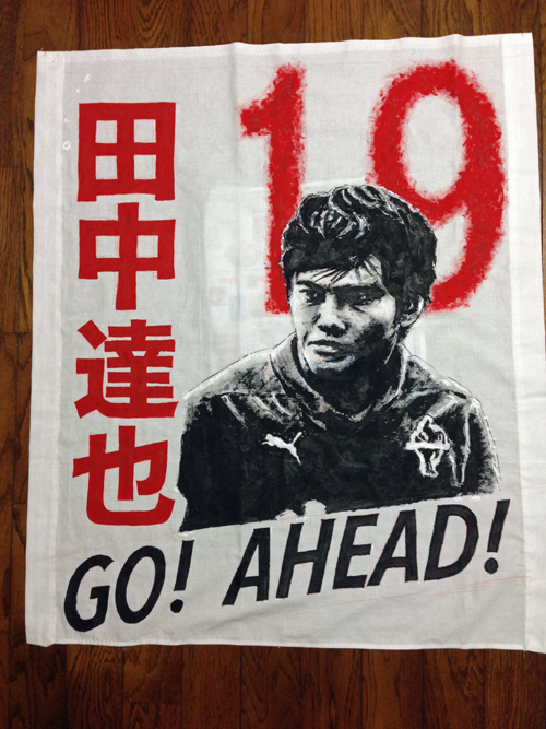 特別指定選手時代に国立競技場であっと言わせてくれた田中くんが正式入団するなら背番号ユニ作ろう!から始まって、試合に出場するならゲーフラ掲げよう!となり、即席で作ったゲーフラは失礼だから 初ゴール決めたらきちんと自分で描こう!となって今回の作成に至ります。