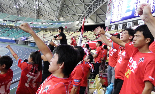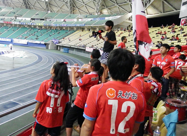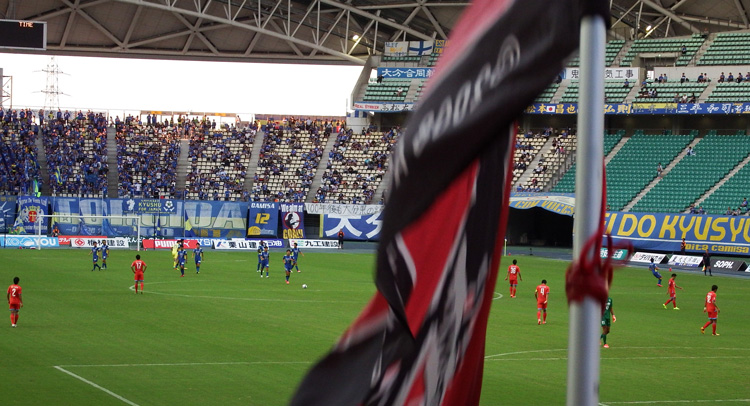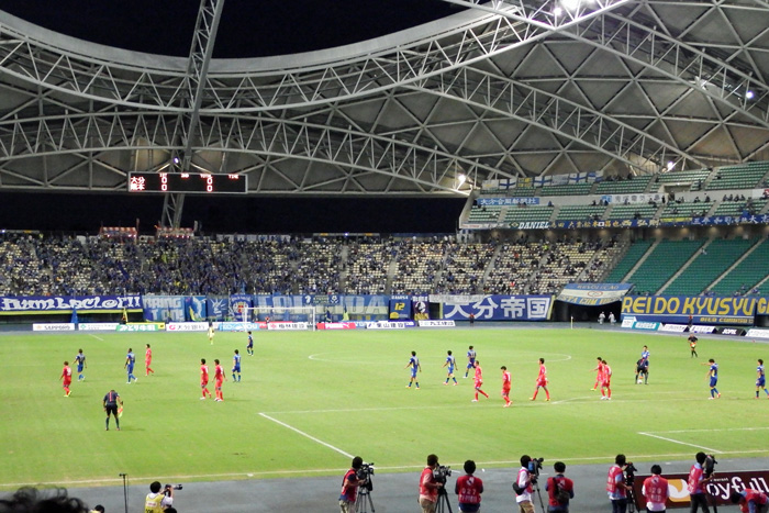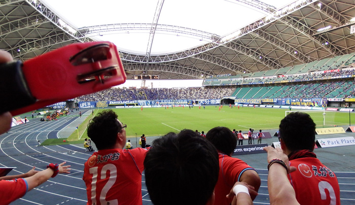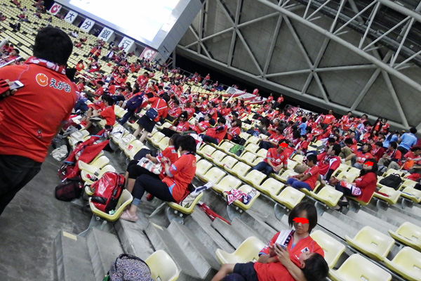 大銀ドームのアウェー席は座って観戦するには椅子の前後の幅が狭くてすごく窮屈。W杯当時の規格座席数を確保するためだったかもしれないけど、観客のことはあまり考えてないなーと思わせるスタジアムです。