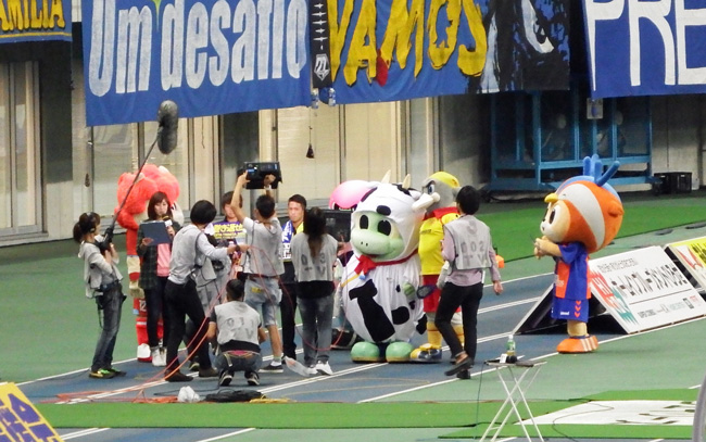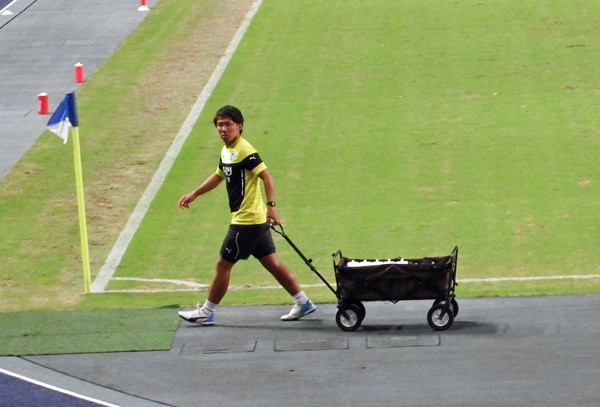 そんなところまで牛乳メーカーのスポンサーモード?と思ったら試合用ドリンクボトルを配るスタッフさんでした。