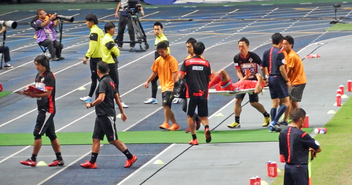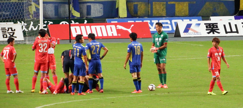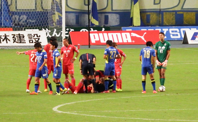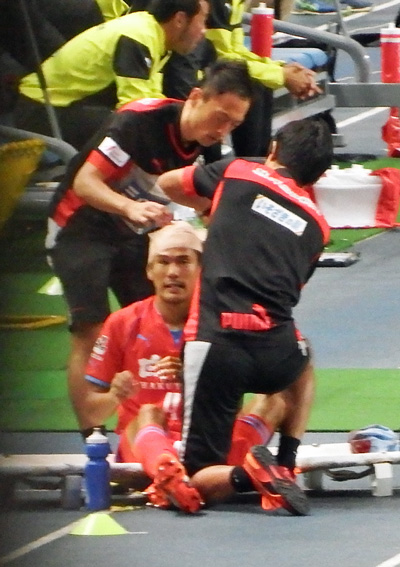 そうこうしてたらボンバイエが流血の惨事(>_<) 頭切っちゃうと流れ落ちるから、もしロアッソのユニがアウェーのブルーだったらとんでもない色合いに染まったと思う。
