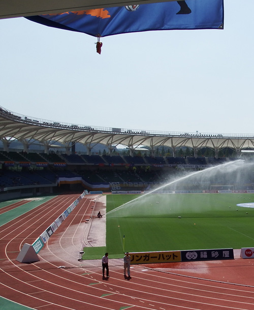 ホームサポは屋根の恩恵で完全に日陰になってるけど、アウェー側は直射日光ギラギラ状態で選手が出てくるまではとても自分の席でのんびりなんてできません。で、かろうじて日陰になってる最上段に待機。