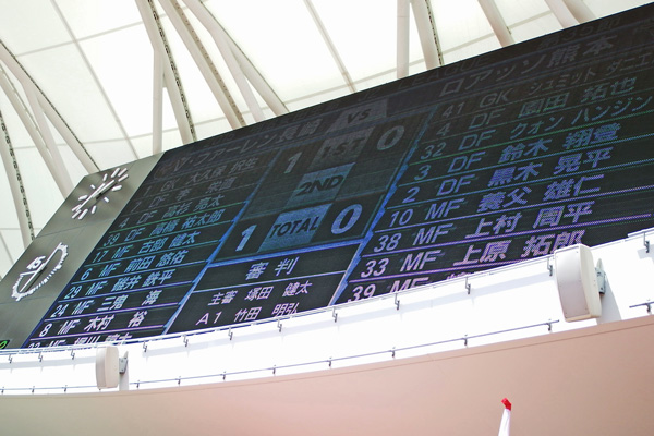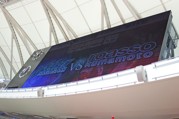 アウェーで一番スクリーンが見づらいスタジアムでもあります。でもこれ以外ではどこにも表示板がないので見上げない限り試合情報も時間経過もわからない。
