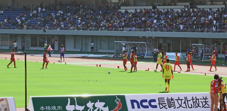 長崎県総では、アウェー側からスタジアム外へ出られる唯一の再入場口からは外階段を降りてまっすぐ歩けばすぐ広場だし。