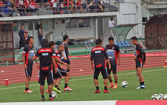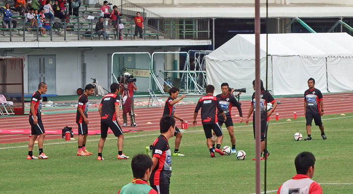試合前練習。シュート練習はなかなか迫力あるボールが飛んできた。
