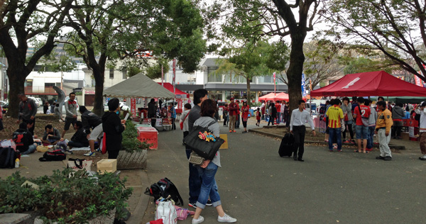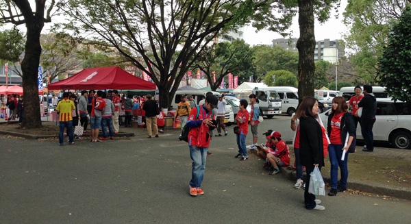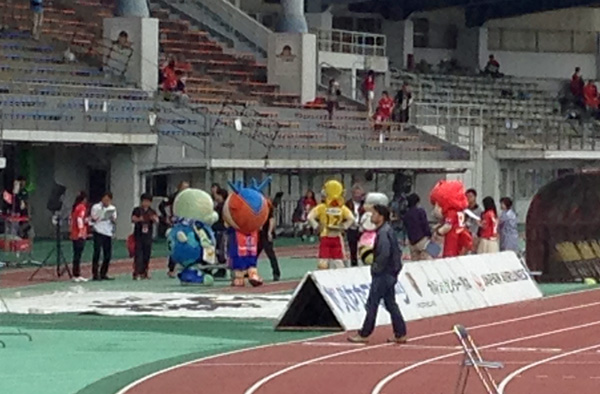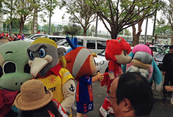 はい水前寺です。九州Jクラブマスコット総出のスタグルメ広場前はずいぶん早くから大賑わいのカオス状態。なんで北九州ユニの人がいるんだろうってナゾはすぐ解けました♪