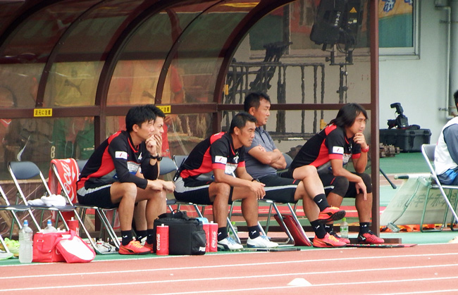 ロアッソベンチ。考える人ポーズで固まるコーチ陣。