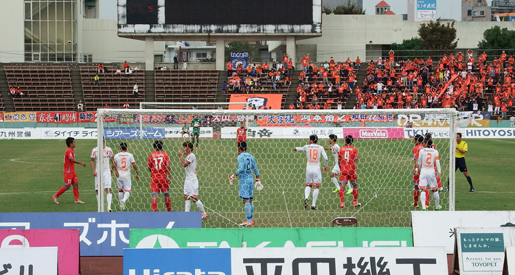 CK。キヨタケくんがボールセットしたとき、ゴール前の誰も動かなかったのに後ろで一人横っ飛びに動きだした選手がいて「誰!」と思ったときにはボールと彼の頭がピターッと皆既日蝕。月蝕でもいいけど。