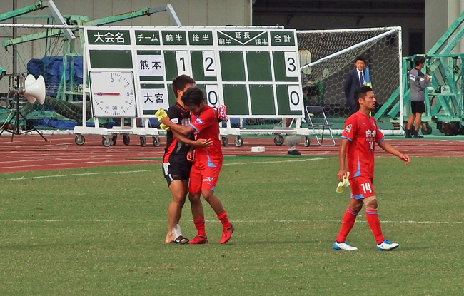 この2点目で目の前の大宮DFエリアに多少のさざ波が立ったように見えました。ふだんの強い大宮なら一枚岩のところが、熊本の選手が入ってくるとほんの少し対応にズレが生じてるような気がしてきて。