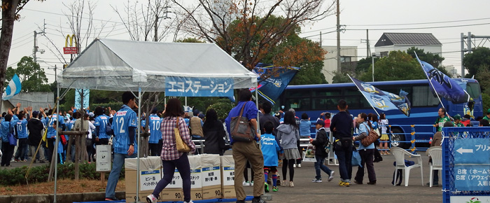 メインスタンド下が関係者出入り口のピカスタは、毎回スタグルメ広場ホーム側がバスのお出迎えエリア。サポーターが大旗を振るいチャントを歌いながら選手を迎えます。