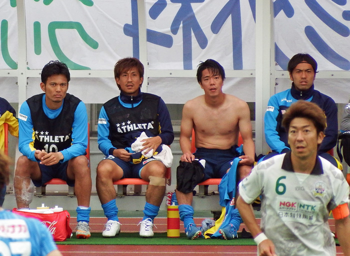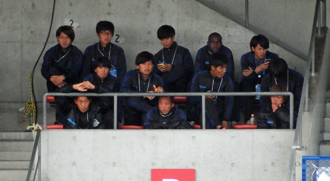 プレーが気になる岐阜控えの皆さん。