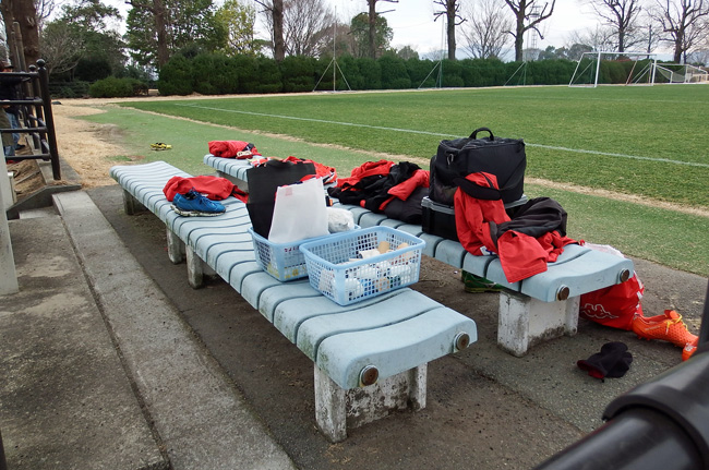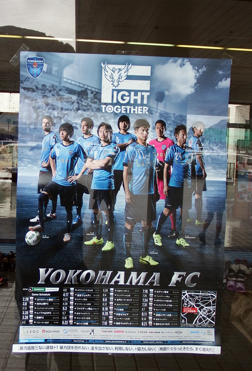 フィールドに付属の建物が小さすぎて相手チームの入る余地がないらしく、ウチの選手の待機場所は本来ならロアッソサポが陣取って応援展開するスタンドで、必然的に観客はそこに入れず、横浜側のスタンドに詰め込まれての呉越同舟。