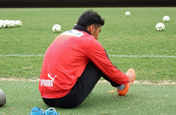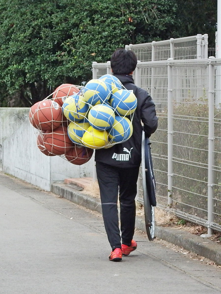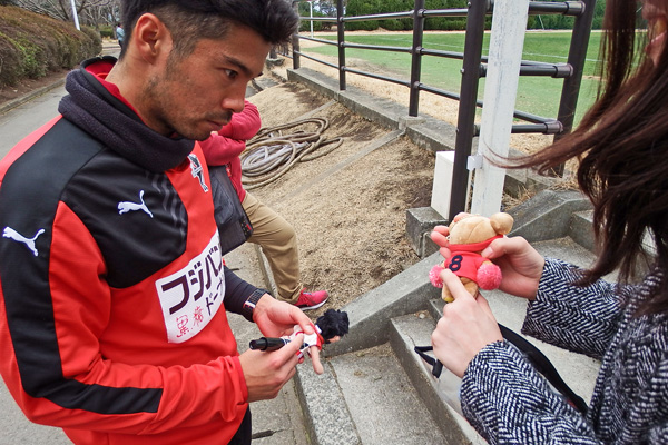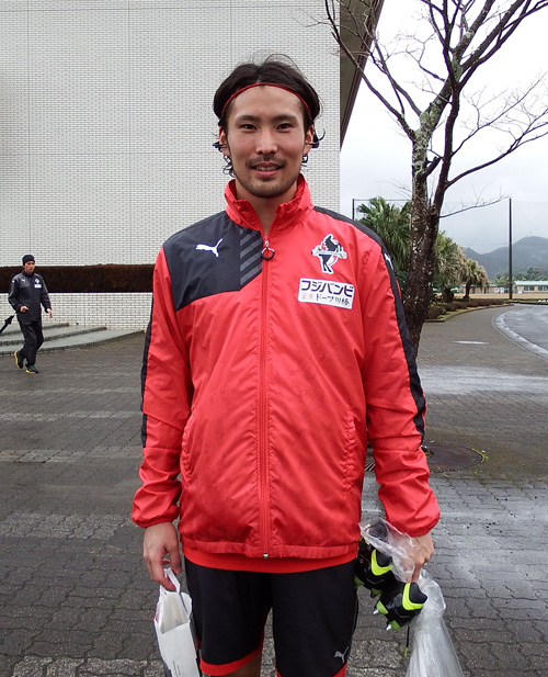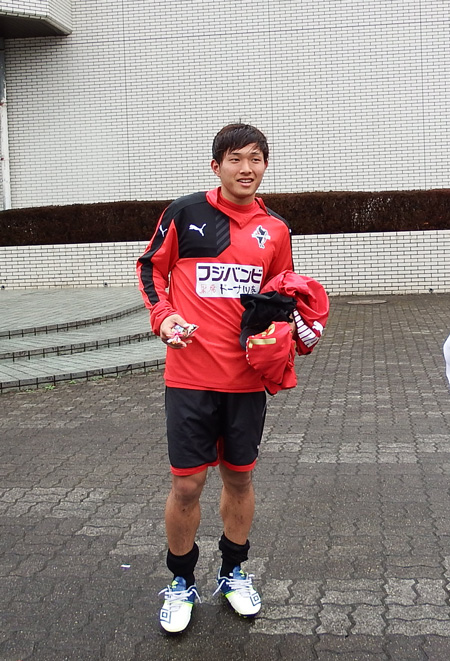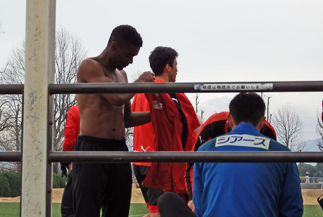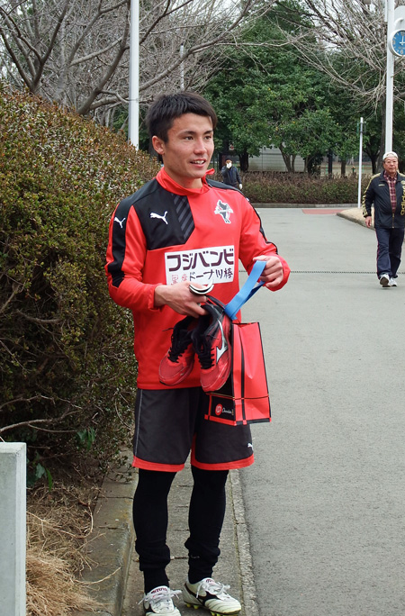 練習後サポさんと会話しつつ、ヘアスタイルに突っ込まれるたびにクラブハウスの出入り口から遠くへジワジワ後退していくしゅーへーくん。