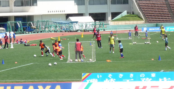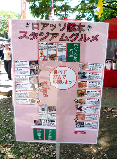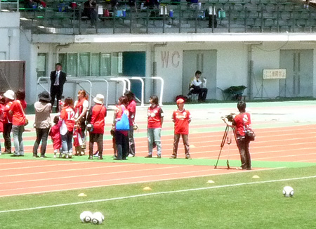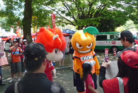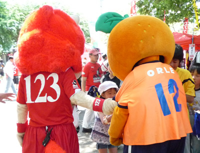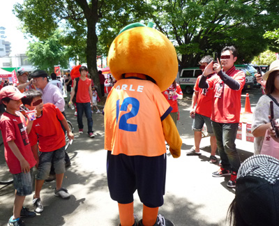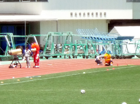 写真とは前後しますが、スタジアム外に出てくる前のマスコット対抗PK戦で、今回ゲストの愛媛FCマスコット代表(だって蜜柑も一種類じゃないしカエルまでいるんだもん)・オーレくんに「マスコット生命に関わる重大事件」(大笑)が起きたと、後で聞きました。