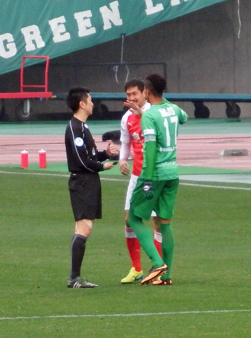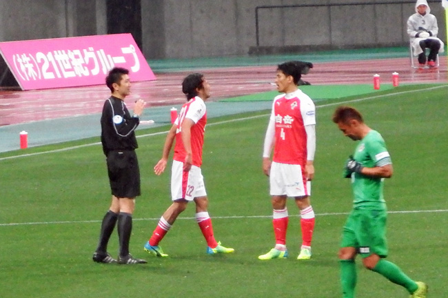 PAに入り込む熊本の選手を何とか止めようとした東京15番くんが黄札2枚めで退場となりました。選手本人の無念さとサポーターの悔しさは自分も経験したことあるからよくわかります。でもこれが勝負の厳しさ。