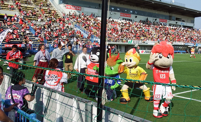 相手チームとスタジアムチームのマスコットと子馬とくまモンと武将隊。カオス!