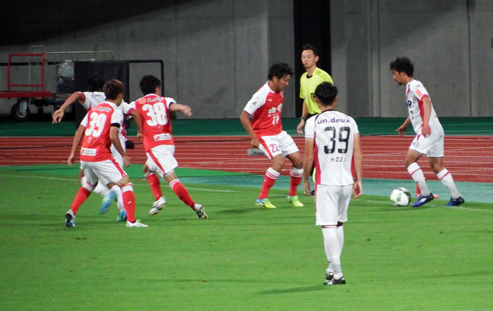 試合は、やはり4位を維持するチームのサッカーに半歩遅れてしまう赤馬衆が必死に食らいつく展開。攻め入るや否や不意を突くミドルシュートなんか迫力満点。こういう攻撃をロアッソで見たいと何度・・・