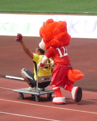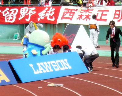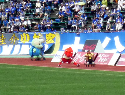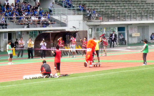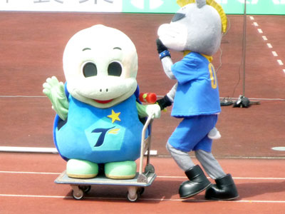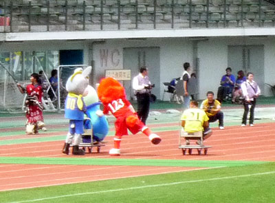 試合前に両チームマスコット対抗の運動会勃発♪