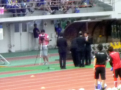 「大分サポーターの皆さんようこそ。私が試合を見に来るとロアッソは負けません!(大分サポブーイング) どうもありがとうございます!(熊本サポ大爆笑)」