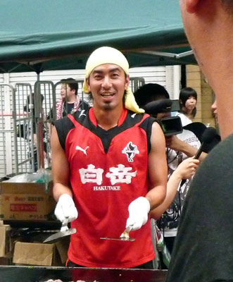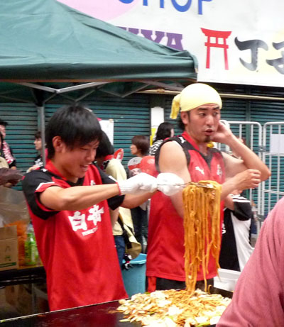 お店の人が手を出す隙もないほどハマってましたねえ。焼きそば買う人より二人の鉄板パフォーマンス(?)に見物衆やんやの喝采。