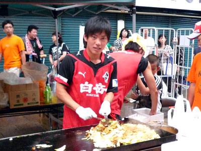 軍手と頭に巻いたタオルがあまりに板に付きすぎてお店に同化しまくっていたタクミくんと、焼きそばのヘラあしらいにプロ並みの手さばきを見せる国宝くん。