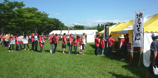 確かJ1のどっかのチームサポが昔「食い道楽」と言われてたけど、J2ではいつの間にかスタグルメ充実度トップクラスらしいロアッソサポも試合前はまず食料調達。元来並ぶの苦手な熊本人ですが、ロアッソサポになってすっかり慣れたご様子~(^^)/。