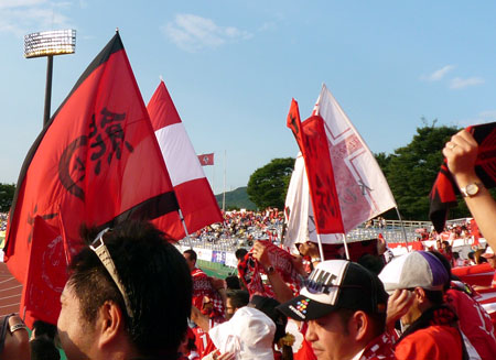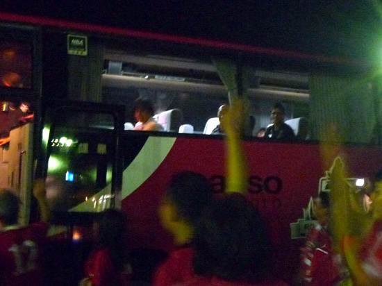 まあとてつもなく横に長ーーーいゴール裏光景。縦の幅が数人の座席分しかないからみんな横へ横へと拡がって必然的に横長の赤い帯のような状態に。