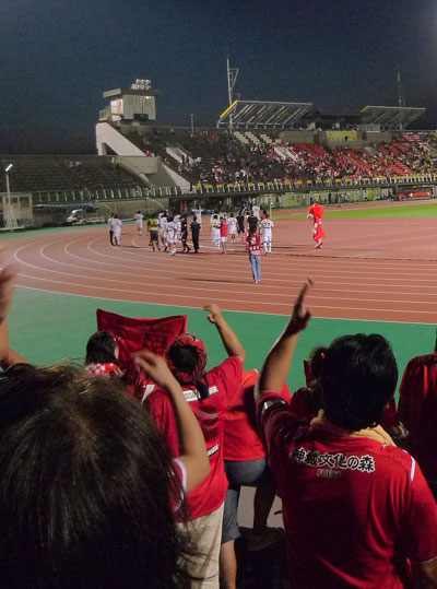 最後になりましたが、ロッソ・ロアッソのスタジアム応援をしてきて初めて、悔しさが体調に影響して、帰路のバスの中の焼酎の匂いで胃の調子がおかしくなりました。でもすぐに氷やお茶をいただいてそれも静まり事なきを得ましたが、これも自分の体調管理のなさ故と反省しています。