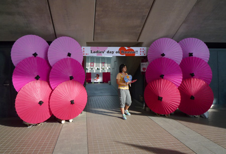 今日は何か雰囲気違うなーと思ったら、崇城大学の学生さんによるレディースデーの飾り付けで、いつもはモノトーンのコンコースがすごく華やか。