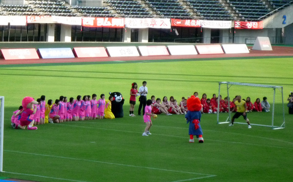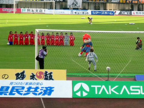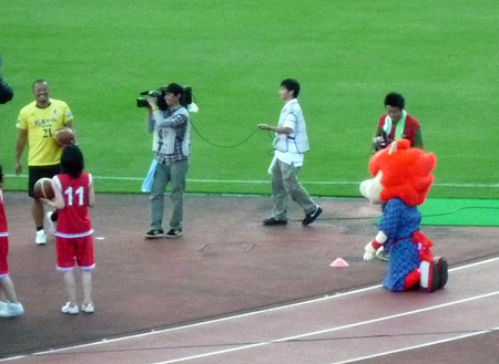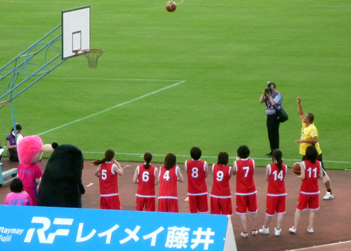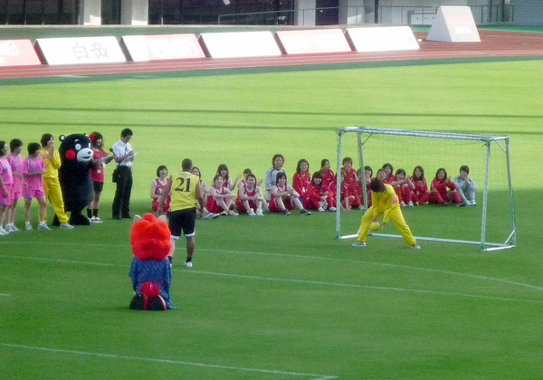 本日はBBの対決相手も全員女子。ルネサンス熊本(サッカー)・オムロンピンディーズ(ハンドボール)・鶴屋百貨店女子チーム(バスケット)にDJKOVA&ロアッソくんが挑むんですが。