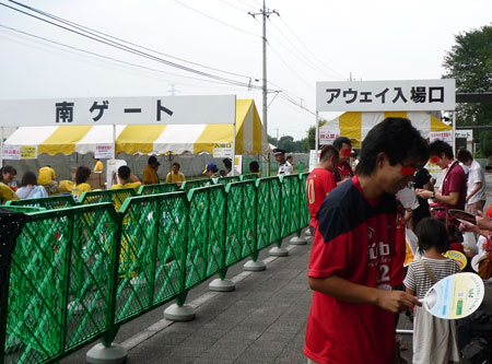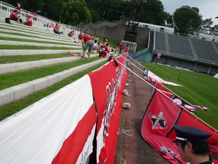 一昨年の天皇杯PK戦で無謀なホームサポの乱入を食らった向こうサイドは完全に遮られ警備員はあの時の3倍くらいウロウロしているし、去年までのナナメ芝生はコンクリートで段々になり手すりまで設置されております。アウェーサポは気合い入れて応援していいよと言わんばかりの歓待ぶりですよー。嬉しいですねぇ。さらにバクスタは観客席設置のため絶賛工事中。さすがU字工事のお膝元(笑)。