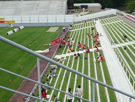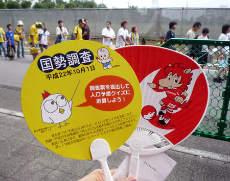 湿度高くて風がない蒸し暑い待ち時間。アウェーサポの私たちも団扇を(黄色い方です)をいただきました。ありがたや~m(_ _)m。