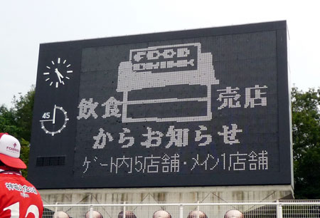 白黒がシャラシャラ入れ替わって表示するタイプ。スタジアムの後ろにスタンドアロン状態。それはいいけど「飲食売店 ゲート内5店舗・メイン1店舗」こんだけなんですか? 諸事情有りましょうが、どう見ても少なっ!