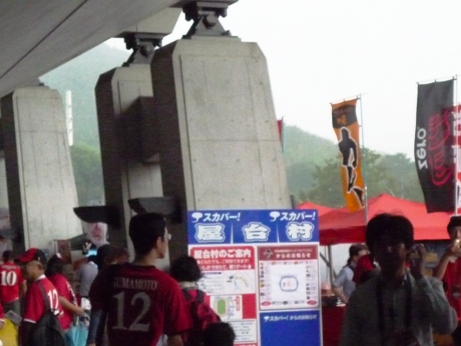 中に入ったものの、雨風ひどくてゴール裏の座席まで行き着けない状態。しょうがないので荷物をビニール袋に詰め込んで財布とカメラだけ持って食料調達の旅に(^^)/