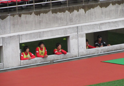 でもさすがサッカー専用スタです。控えの選手はこんなところから観戦。