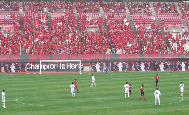 そして、J1王者のホームスタジアムという完全なる敵地で戦う、白装束の赤馬衆の姿。