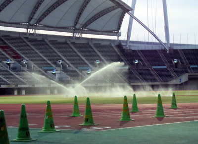 その前に行われていた芝養生でのスプリンクラーの水しぶき!