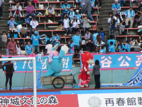 芸でも何でもなく単に一馬力でアウェーチームマスコットを乗っけてリヤカー引いてるだけなのに、なんでこんなにおもしろいんだろ。