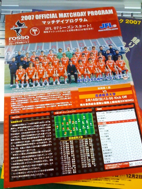 2007年は言うまでもなく、ロッソ熊本が昇格を賭けてアクセル踏み込みそのまま驀進してJリーグ加入をもぎ取った「JFL最後の年」で、これは開幕戦で購入した当時のJFLガイドブックです。