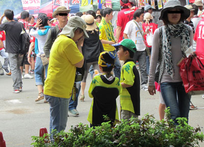 親子でご来場の千葉サポさんです。今日は暑いから子供さんの水分補給しっかりとお願いしますね〜。