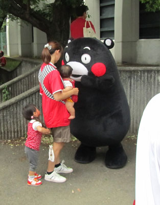さて、某バスツアーのお代を払ってたらなぜかこんな端っこにくまモン登場。泣かれないようにおそるおそるママに抱っこされた赤ちゃんにアプローチ(笑)