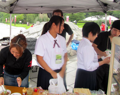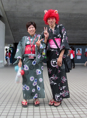 コンコースで鶴を折っていたら浴衣のお嬢さんコンビ発見。赤髪さんはロアッソ君の妹さんですか〜(笑)