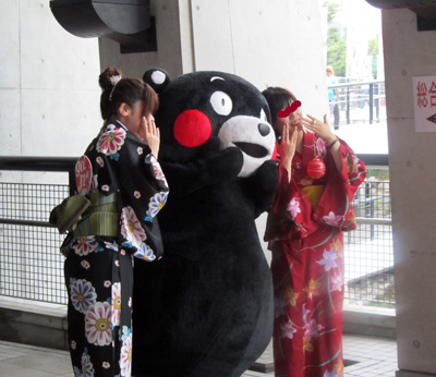 コンコースで両手に花のくまモンを見つけました。浴衣のお嬢さんが可愛い♪