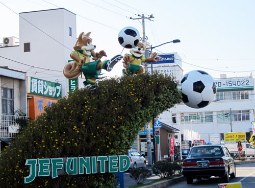 駅からスタジアムへの一本道のどこを切ってもジェフ千葉仕様。これは柏駅からのレイソルロードを歩いたときを思い出す光景でした。
