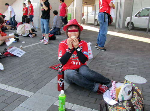 アウェーサポーター待機列はスタジアムの陰で助かりました。もぐもぐ。