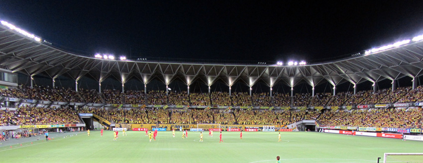 ホームゴール裏びっしりの黄色いサポーターとメインバクスタも完全にひとつになった応援のリズムは、なんか一緒にノリたくなるような一体感。これが年月かけて積み重なった分厚い応援ですよね。いつかウチもあんな応援ができるようになりたい!!